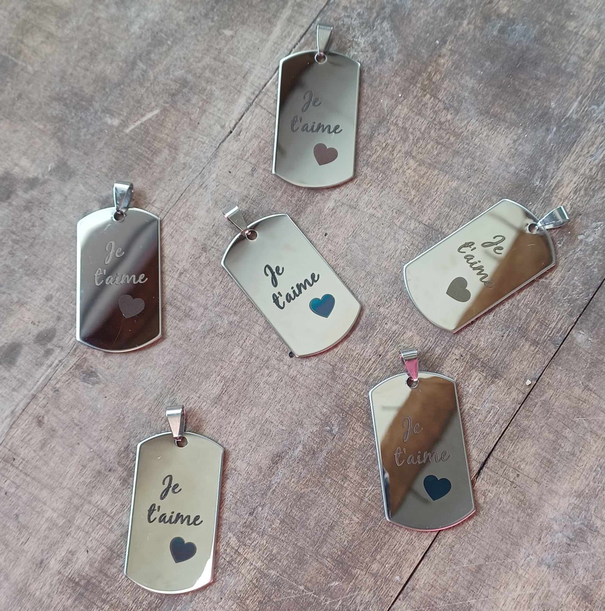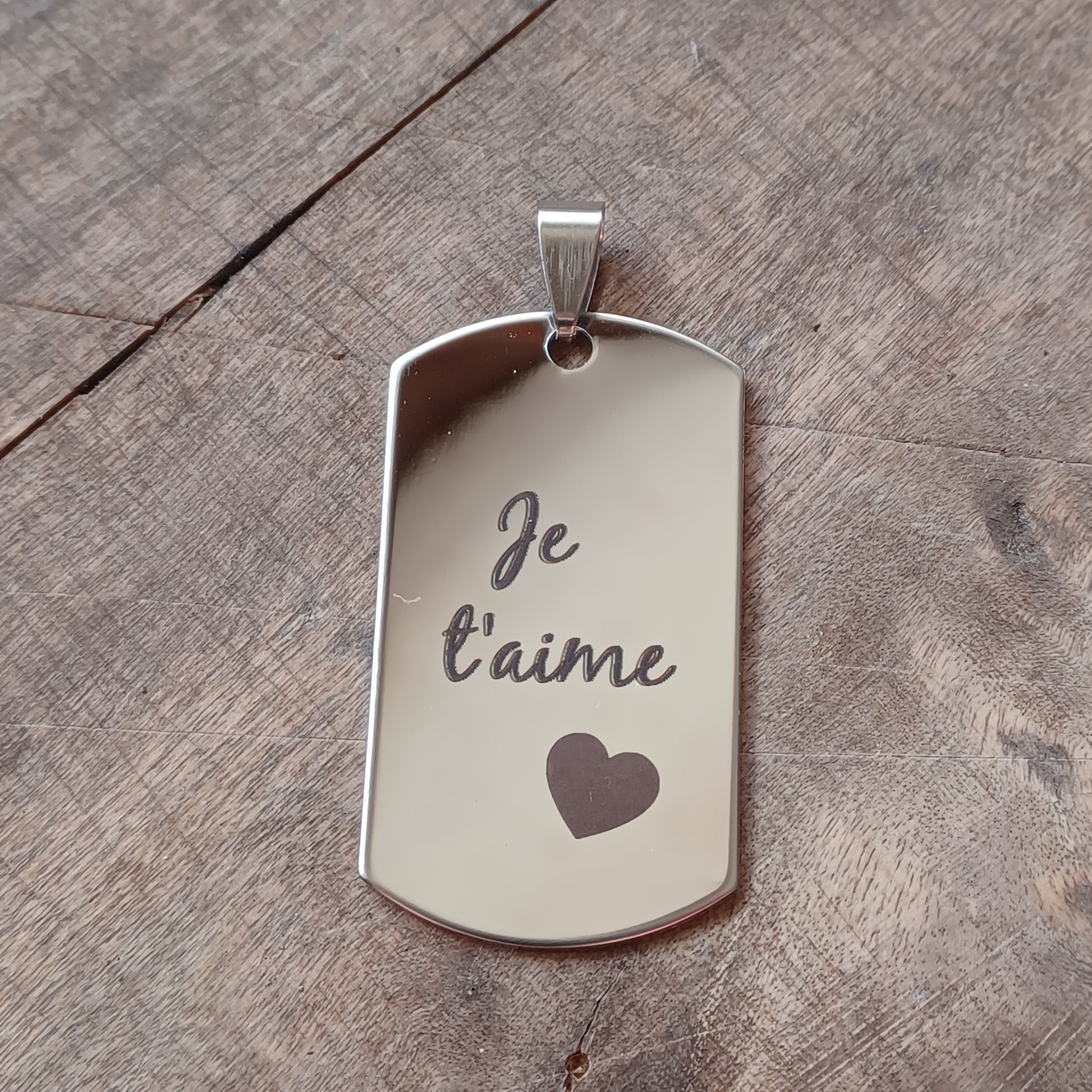 Médaille, pendentif, rectangle en acier inoxydable, recto brillant, verso brossé mat.